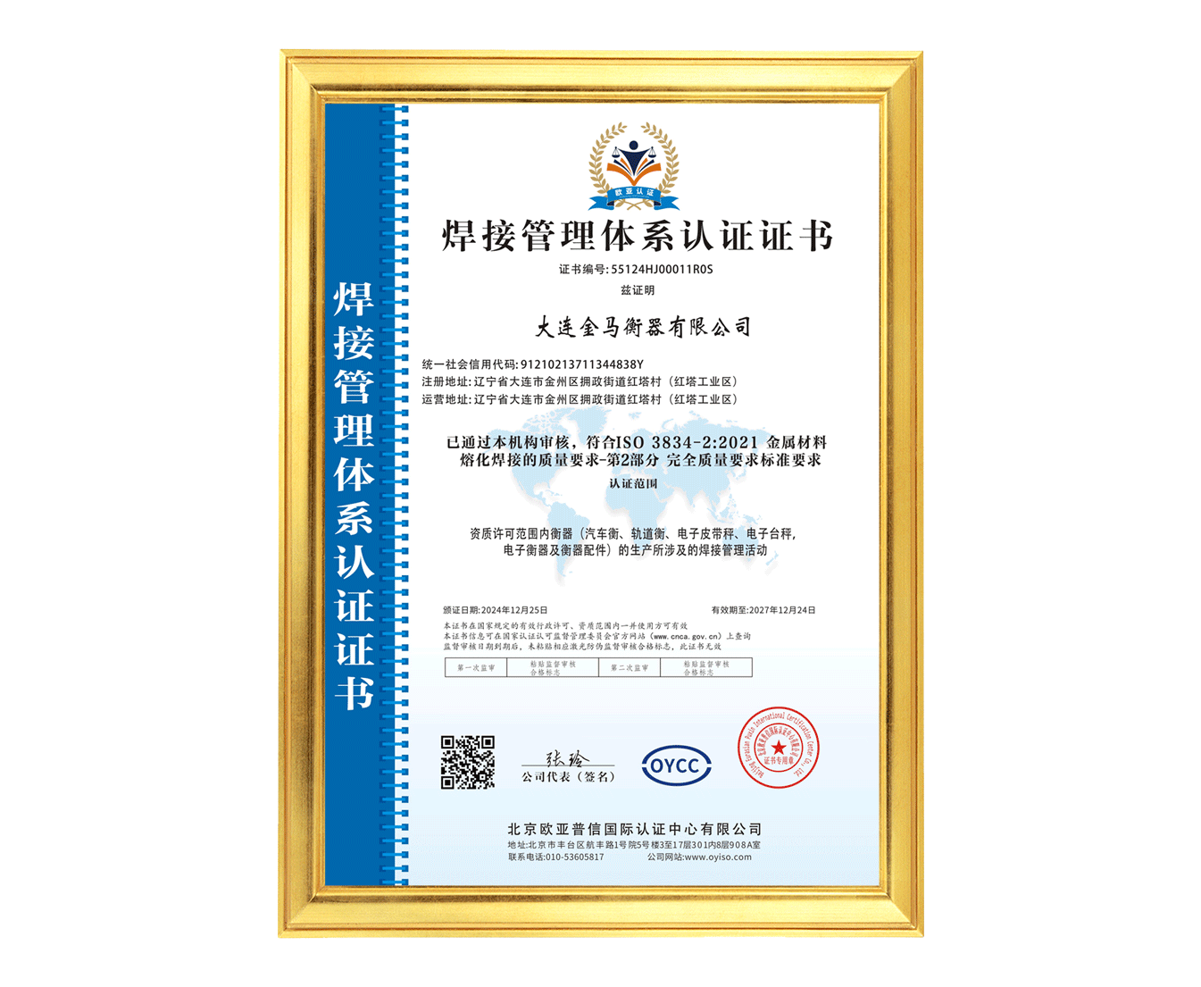 焊接管理體系認證證書